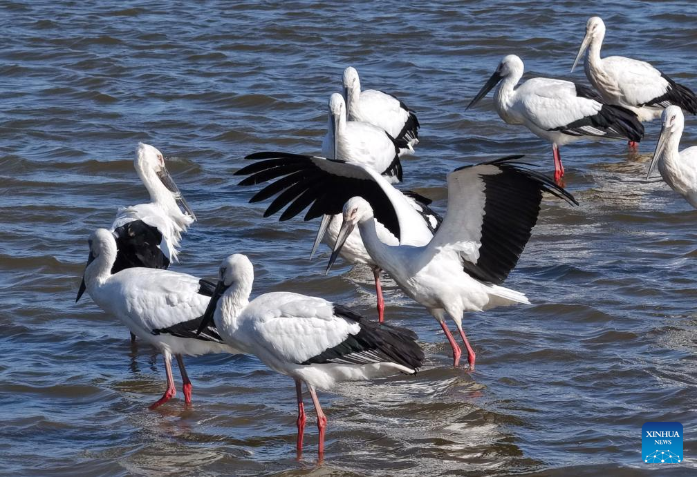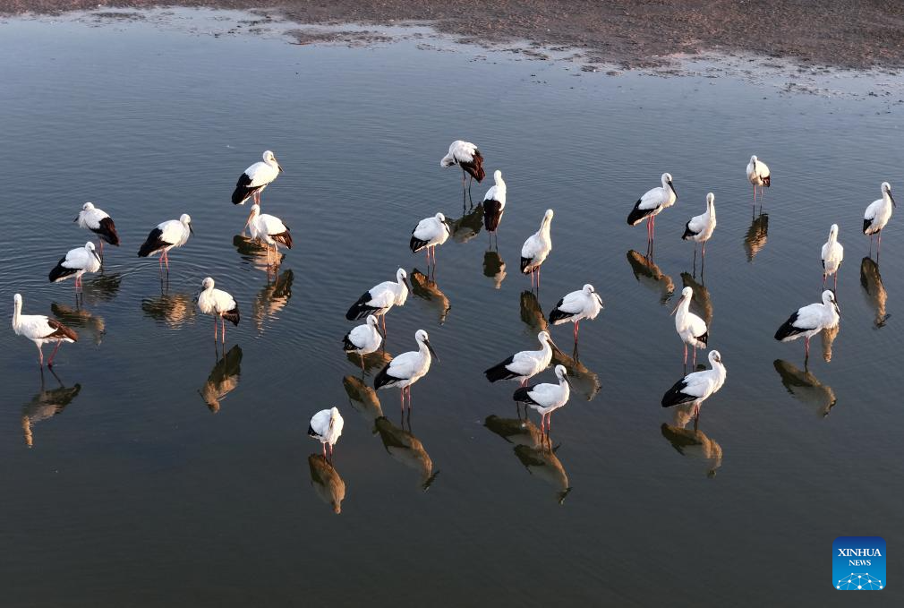 An aerial drone photo taken on Nov. 30, 2025 shows oriental white storks foraging on a coastal wetland in Tangshan, north China's Hebei Province. Coastal wetlands in the city of Tangshan are important habitats for migratory birds. (Xinhua/Yang Shiyao)