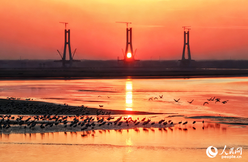 Bridge towers, sunset light, and flocks of common cranes roaming the riverbank shallows of the Yellow River create a spectacular evening view in Fengqiu county, central China's Henan Province, Dec. 1, 2025. (People's Daily Online/Cheng Minghui)