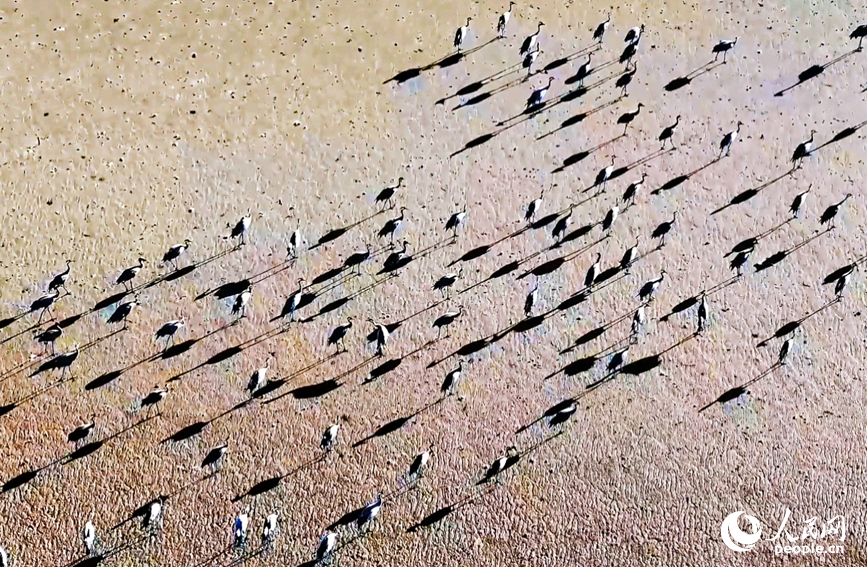 Photo shows groups of common cranes moving across sandy riverbanks of the Yellow River in Fengqiu county, central China's Henan Province, Dec. 1, 2025. (People's Daily Online/Cheng Minghui)