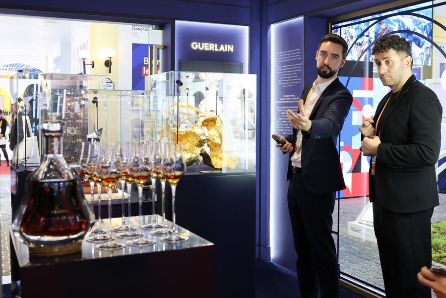 Exhibitors show exhibits at the France Pavilion during the seventh China International Import Expo (CIIE) in east China's Shanghai, Nov. 5, 2024. (Xinhua/Yin Gang)