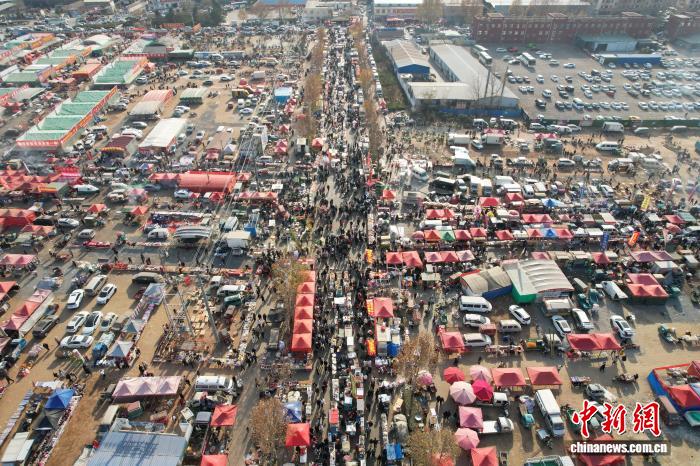 Aerial photo taken on Dec. 8, 2025 shows a bustling scene of Caowa Market in Linshu county, Linyi city, east China's Shandong Province. (China News Service/Wang Feng)
