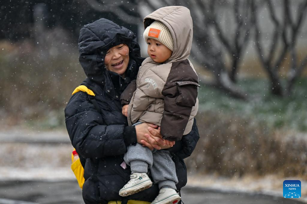 Tourists pose for photos amid snowfall in Beijing, China, Dec. 12, 2025. Beijing witnessed its first significant snowfall of this winter season on Friday. (Xinhua/Li Xin)