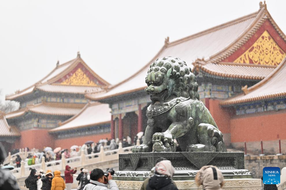 Tourists visit the Palace Museum amid snowfall in Beijing, China, Dec. 12, 2025. Beijing witnessed its first significant snowfall of this winter season on Friday. (Xinhua/Li Xin)