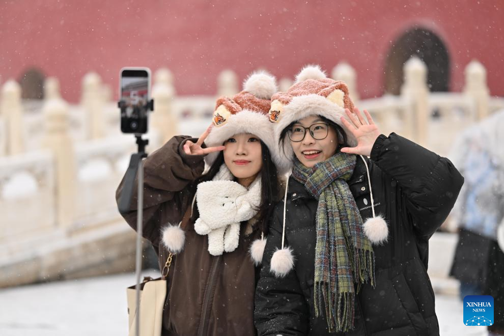 Tourists enjoy snowfall at the Palace Museum in Beijing, China, Dec. 12, 2025. Beijing witnessed its first significant snowfall of this winter season on Friday. (Xinhua/Li Xin)