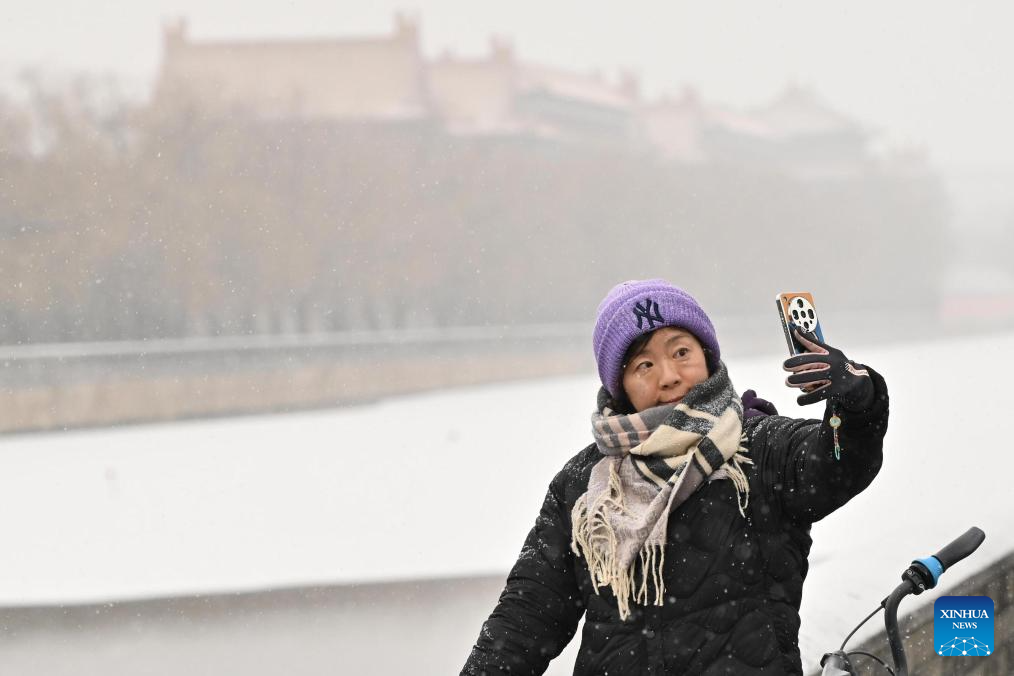 A tourist poses for a selfie amid snowfall outside the Palace Museum in Beijing, China, Dec. 12, 2025. Beijing witnessed its first significant snowfall of this winter season on Friday. (Xinhua/Li Xin)