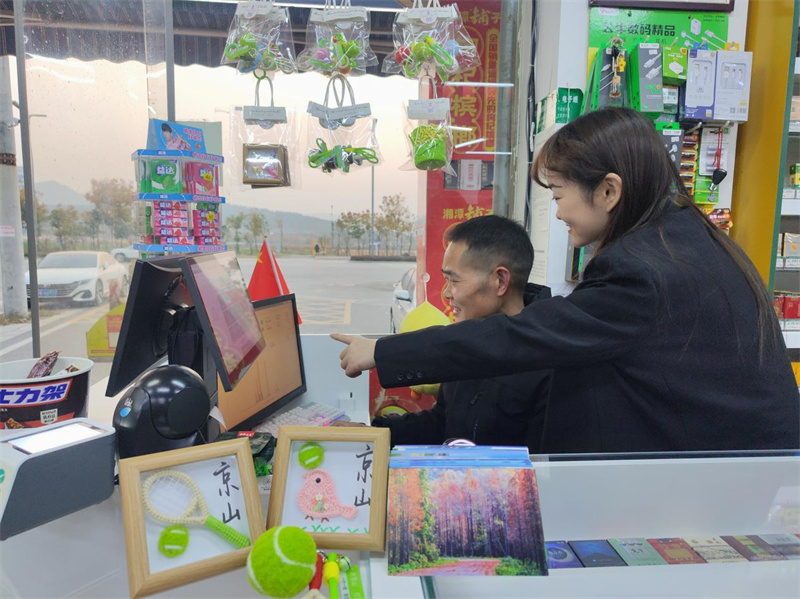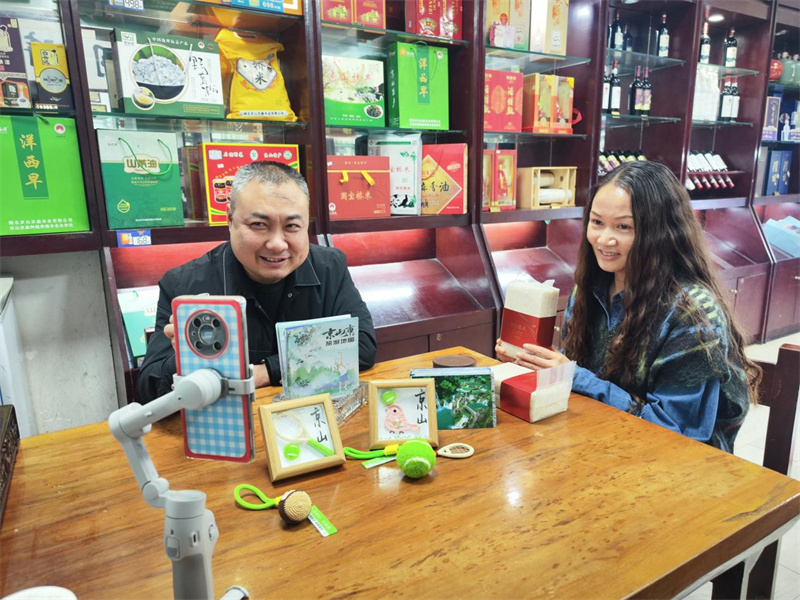 A sales manager assists a shop owner with livestreaming to showcase specialty products at a store in Jingshan, a county-level city under Jingmen, central China's Hubei Province. (Photo/Luo Rong)