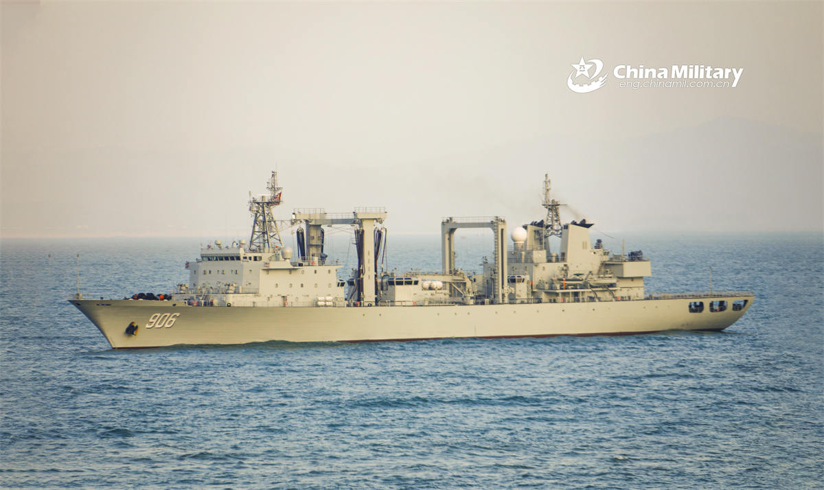 The comprehensive supply ship Honghu (Hull 906) attached to a flotilla under the Chinese PLA Navy steams to the designated training area during a realistic maritime training exercise in late November, 2025. (eng.chinamil.com.cn/Photo by Li Junlin)