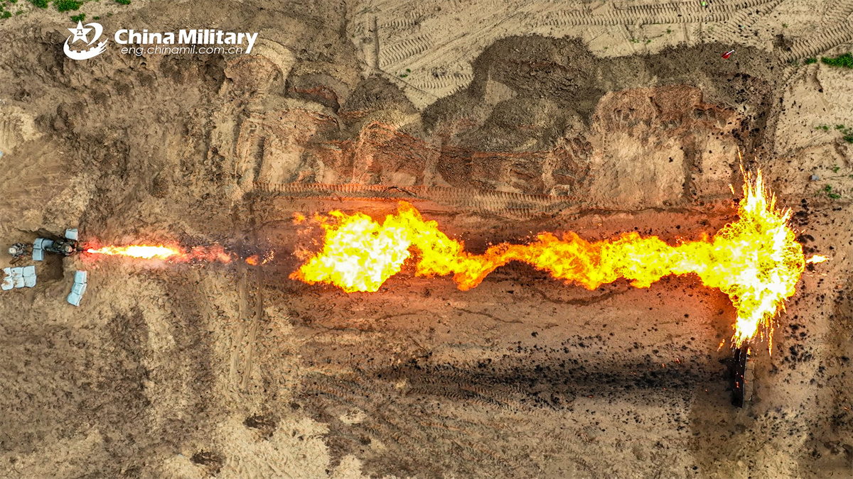 A flamethrower operator assigned to a chemical defense detachment of a brigade under the Chinese PLA Army ignites the controlled fire with a flamethrower against a fire-proof wall on December 6, 2025. (eng.chinamil.com.cn/Photo by Huang Weibo)