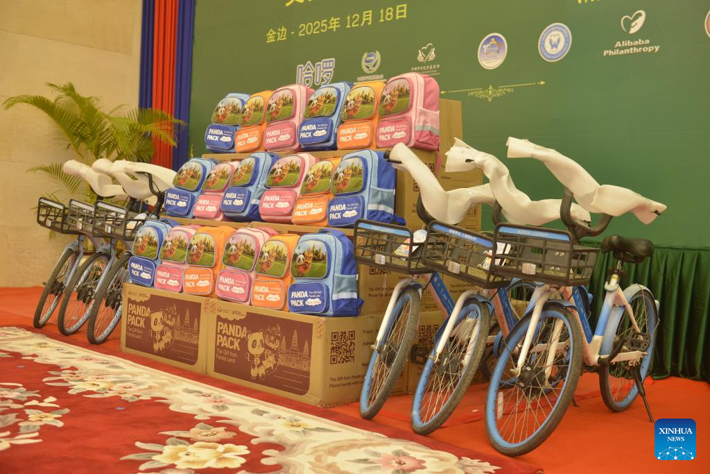 PHNOM PENH, Dec. 18 (Xinhua) -- The China Foundation for Rural Development (CFRD) on Thursday donated 2,500 bicycles and 21,600 Panda packs to Cambodian schools for distribution to underprivileged students.
