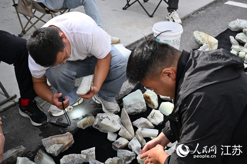 Jade buyers check the quality of raw jade at a jade fair in Pizhou, a county-level city administered by Xuzhou, east China's Jiangsu Province. (People's Daily Online/Zhang Hantian)