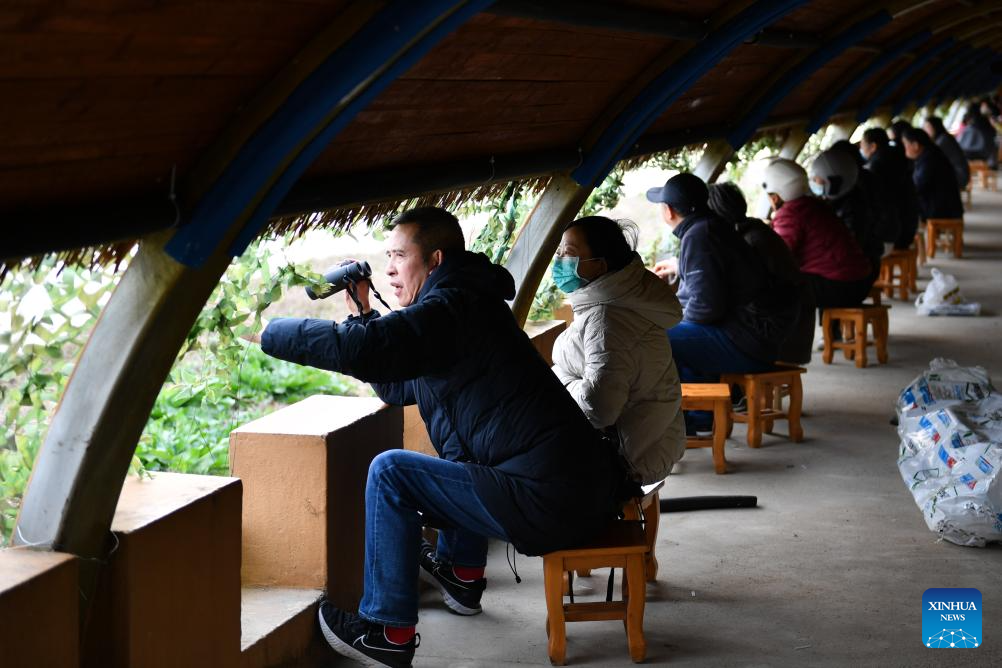 Visitors watch migratory birds at the Donggu Lake in Yueyang City, central China's Hunan Province, Dec. 20, 2025. (Xinhua/Chen Zhenhai)
