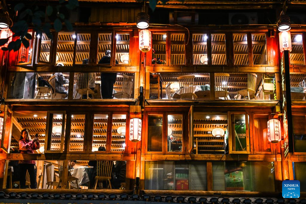 Tourists dine at a restaurant in Zhaoxing Dong village of Liping County, southwest China's Guizhou Province, Dec. 19, 2025.