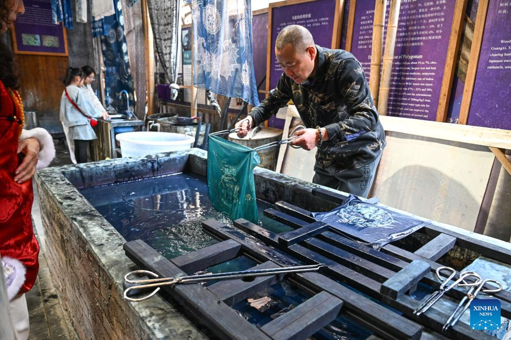 A tourist tries batik making at a rural cooperative in Zhaoxing Dong village of Liping County, southwest China's Guizhou Province, Dec. 20, 2025.