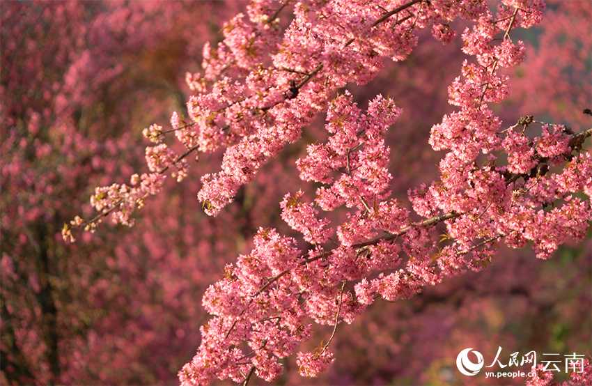 Photo shows winter cherry blossoms in the cherry valley on Wuliang Mountain in Nanjian Yi Autonomous County, Dali Bai Autonomous Prefecture, southwest China's Yunnan Province. (Photo/Yang Guangyu)