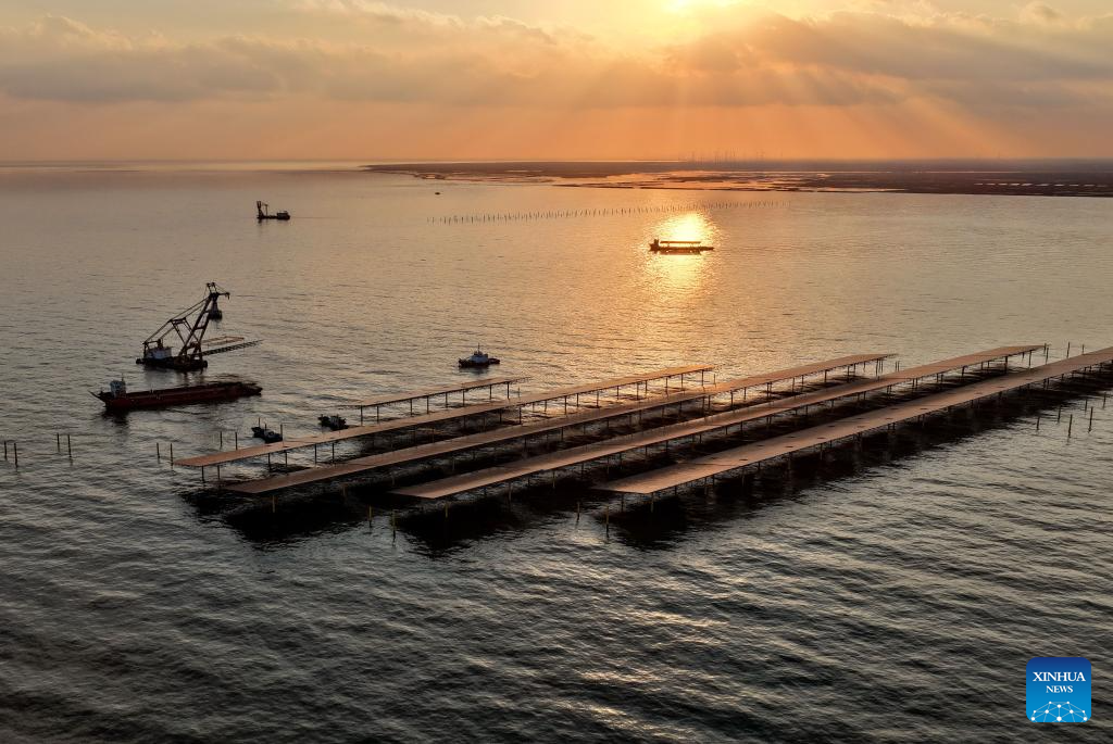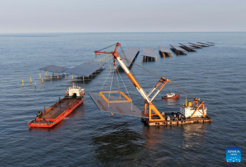 A drone photo taken on Dec. 24, 2025 shows workers operating machines at an offshore photovoltaic power station in waters off Changli County, north China's Hebei Province. (Xinhua/Yang Shiyao)