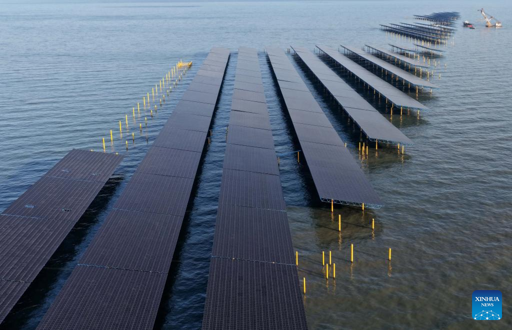 A drone photo taken on Dec. 24, 2025 shows solar panels at an offshore photovoltaic power station in waters off Changli County, north China's Hebei Province. (Xinhua/Yang Shiyao)