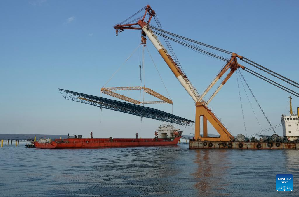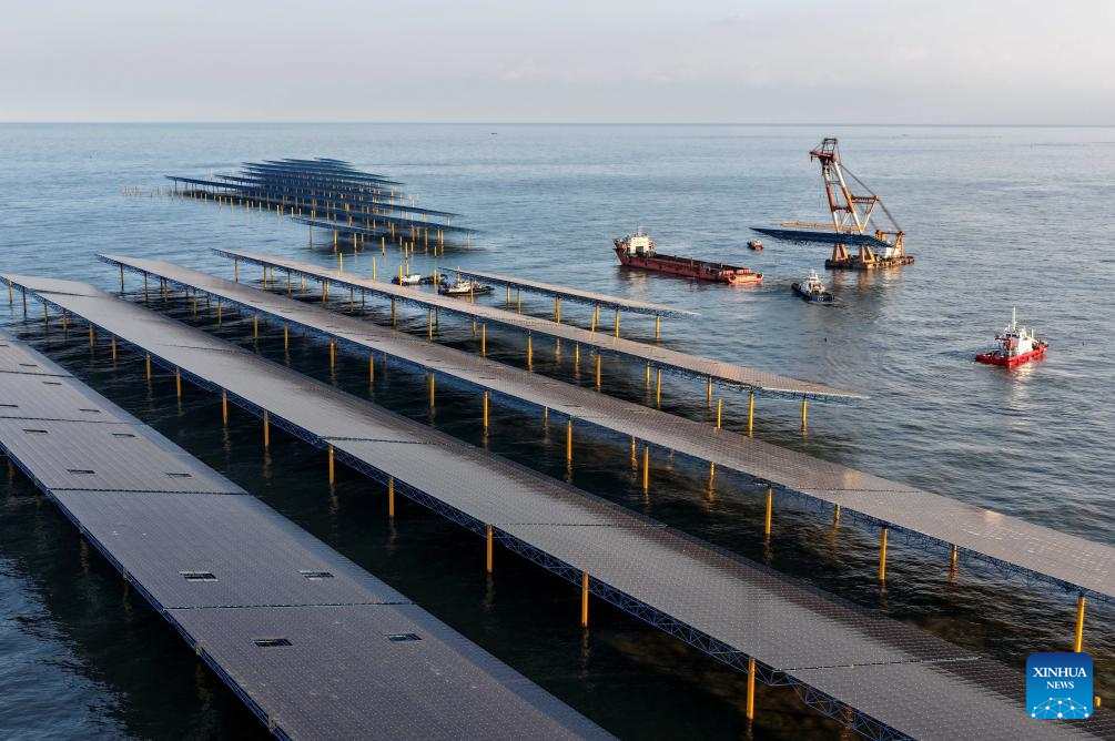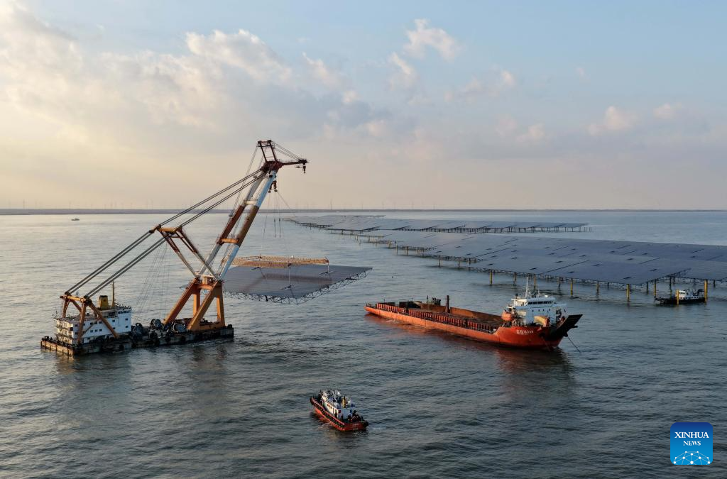 Workers operate machines at an offshore photovoltaic power station in waters off Changli County, north China's Hebei Province, Dec. 24, 2025. (Xinhua/Yang Shiyao)