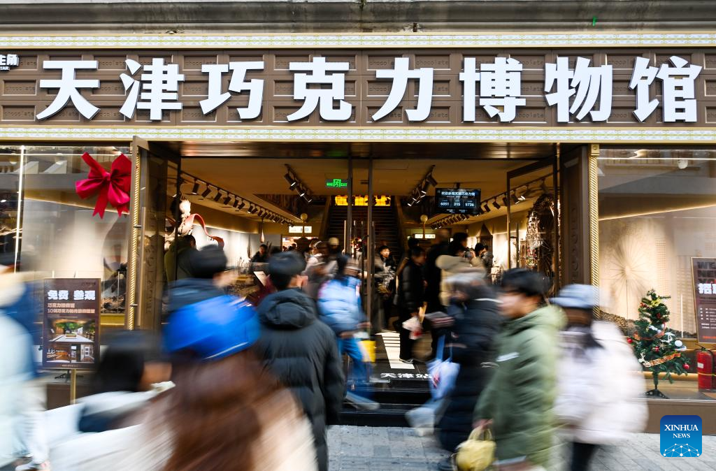 Tourists visit a chocolate museum in Tianjin, north China, Dec. 28, 2025. A chocolate museum has officially opened to the public in Tianjin. The museum displays more than 20 sets of handmade chocolate sculptures, with a total chocolate usage of nearly 10 tonnes. (Xinhua/Zhao Zishuo)