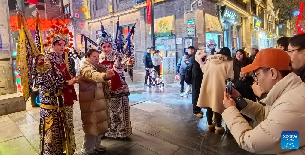 A visitor poses for photos with artists on the Qianmen pedestrian street in Beijing, capital of China, Dec. 26, 2025. As the New Year approaches, the Qianmen pedestrian street, a landmark commercial street in Beijing, is decorated with various festoons. (Xinhua/Li Xin)