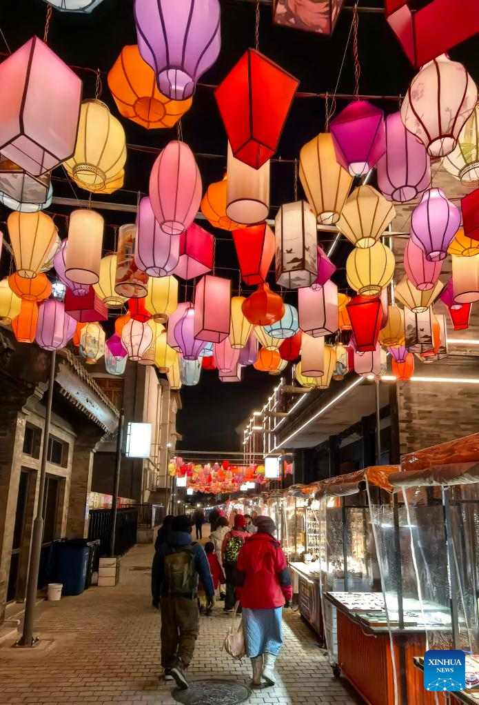 Lanterns are seen hung above the Qianmen pedestrian street in Beijing, capital of China, Dec. 26, 2025. As the New Year approaches, the Qianmen pedestrian street, a landmark commercial street in Beijing, is decorated with various festoons. (Xinhua/Li Xin)