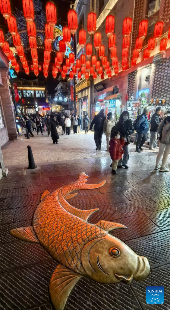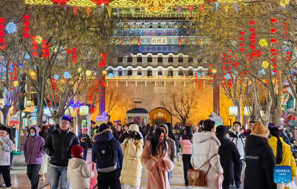 People enjoy night view on the Qianmen pedestrian street in Beijing, capital of China, Dec. 26, 2025. As the New Year approaches, the Qianmen pedestrian street, a landmark commercial street in Beijing, is decorated with various festoons. (Xinhua/Li Xin)