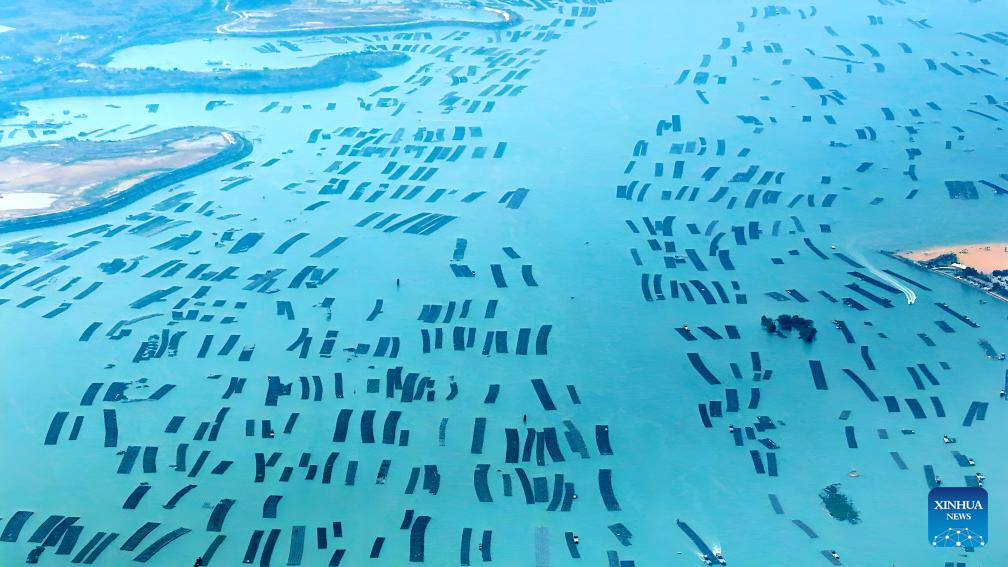 An aerial drone photo taken on Dec. 27, 2025 shows oyster cultivation fields in the Maowei Sea in Qinzhou, south China's Guangxi Zhuang Autonomous Region. In winter, the Maowei Sea in Guangxi presents picturesque scenery. In recent years, Guangxi has implemented high-standard ecological protection of the marine environment in the Beibu Gulf, transforming the Maowei Sea into a new cultural and tourism landmark. (Xinhua/Zhang Ailin)