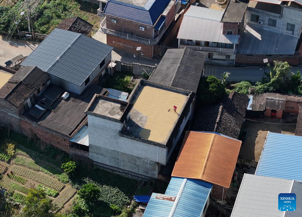 A drone photo shows a villager airing grain on the roof of a house at Longtian Village of Mashan Town in Liucheng County, south China's Guangxi Zhuang Autonomous Region, Nov. 16, 2025.
