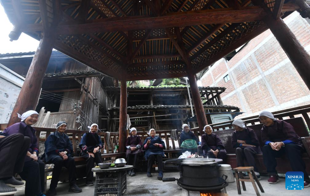 Senior villagers chat at Gaoding Village of Dudong Town in Sanjiang Dong Autonomous County, south China's Guangxi Zhuang Autonomous Region, Nov. 5, 2025.