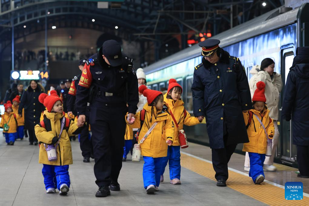 Staff members of train K7041 guide children from Guangxi to board the train at Harbin Railway Station in Harbin, northeast China's Heilongjiang Province, on Dec. 30, 2025.