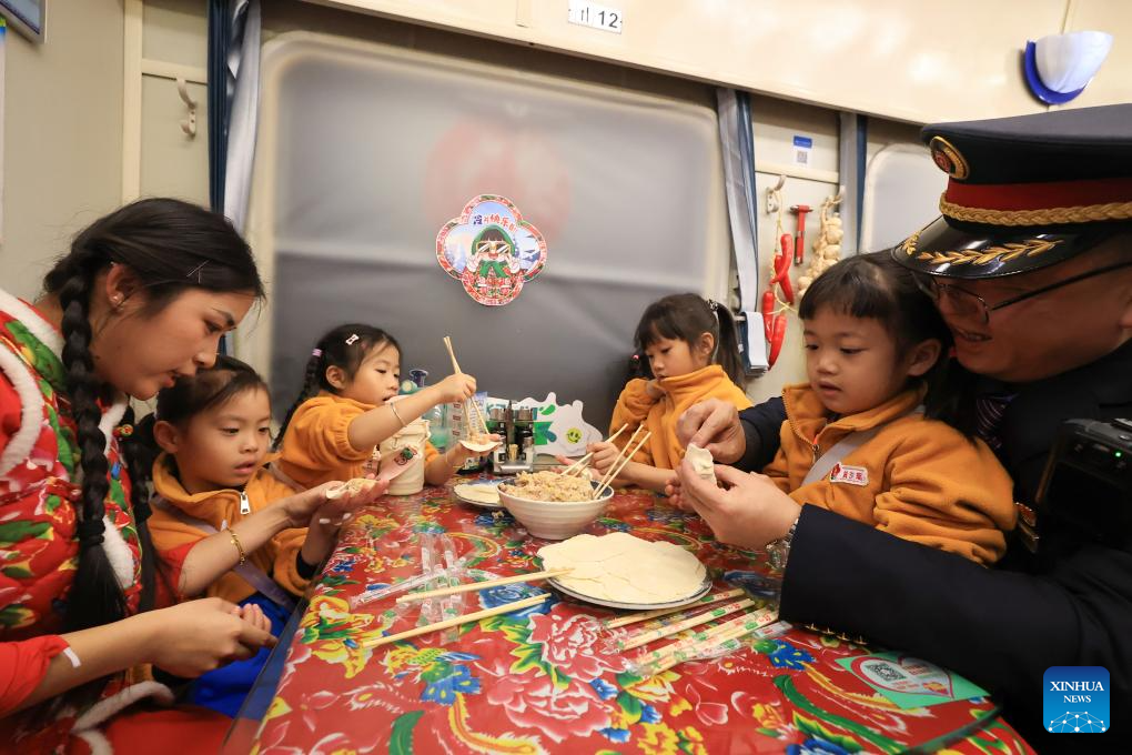 Children from Guangxi experience dumpling-making on train K7041 in northeast China's Heilongjiang Province, on Dec. 30, 2025.