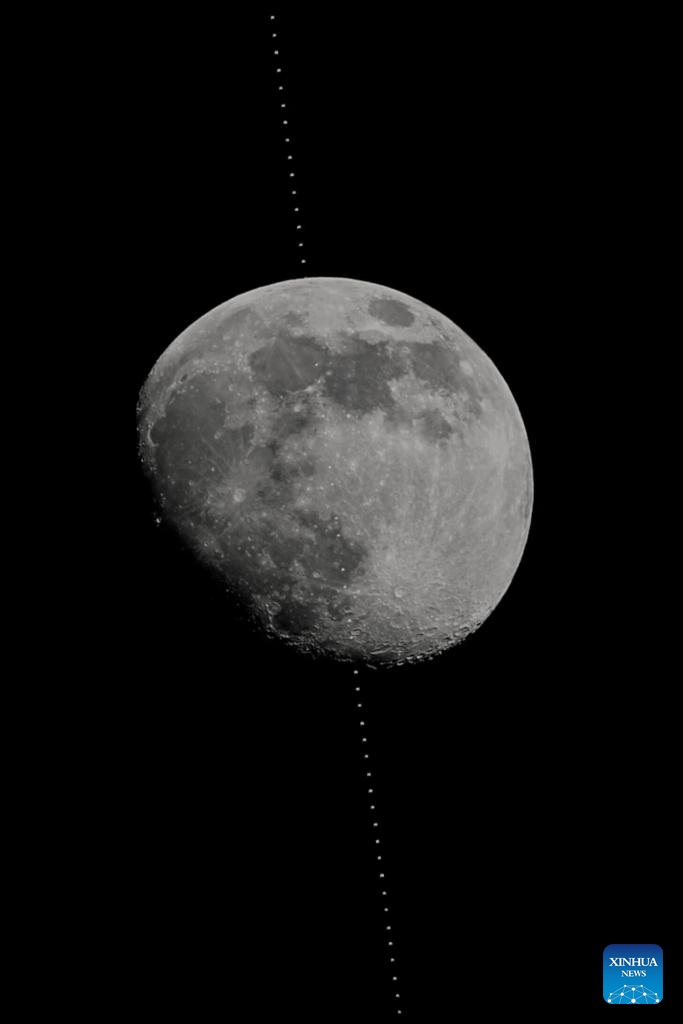 A stacked composite photo taken on Dec. 31, 2025 in Beijing, China shows the Chinese space station passing in front of the Moon. (Xinhua/Xing Guangli)