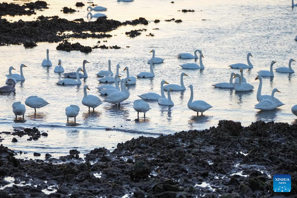 Wintering whooper swans are pictured at a national nature reserve in Rongcheng, east China's Shandong Province, Jan. 5, 2026. Over 6,000 migratory whooper swans have flocked to Rongcheng to spend the winter. (Xinhua/Xu Suhui)
