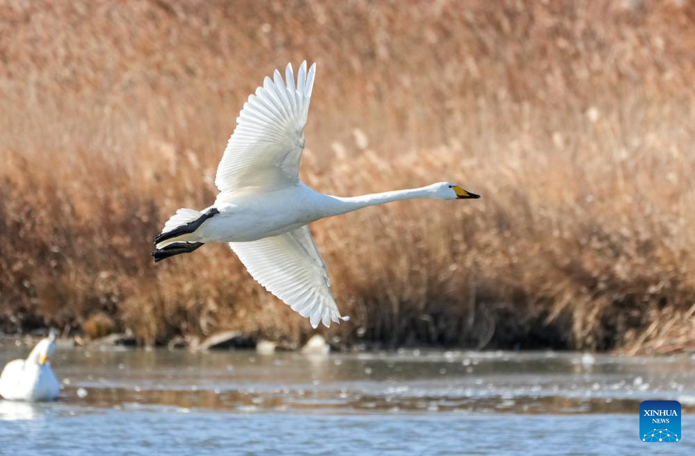 A wintering whooper swan flies at a national nature reserve in Rongcheng, east China's Shandong Province, Jan. 5, 2026. Over 6,000 migratory whooper swans have flocked to Rongcheng to spend the winter. (Xinhua/Xu Suhui)
