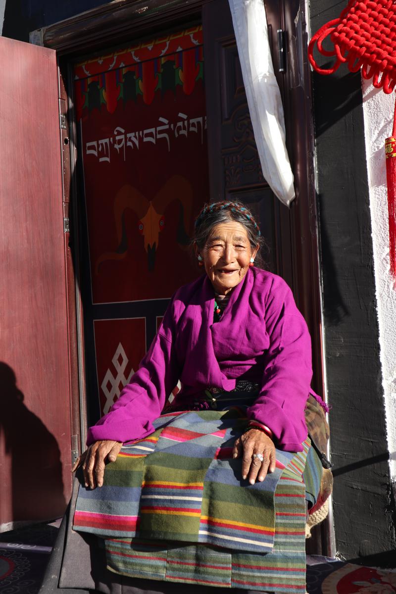 Nesemo village resident Kunzang, from Nesemo village in Dingri county's Shekar township, soaks herself in the morning sunshine on Monday in her new house, which was built by the government after the 6.8-magnitude quake one year ago. [Photo by Palden Nyima/chinadaily.com.cn]