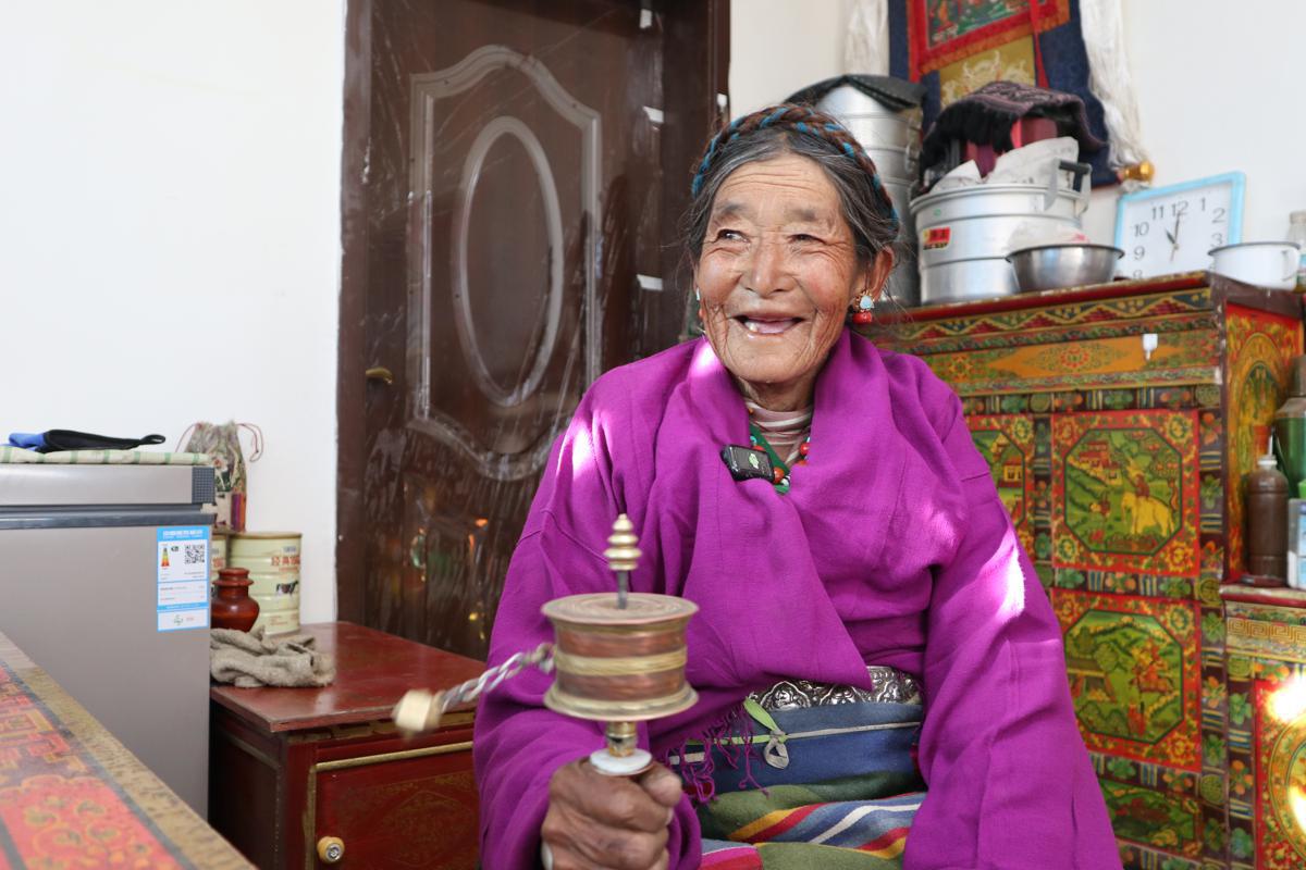 Nesemo village resident Kunzang, from Nesemo village in Dingri county's Shekar township, soaks herself in the morning sunshine on Monday in her new house, which was built by the government after the 6.8-magnitude quake one year ago. [Photo by Palden Nyima/chinadaily.com.cn]