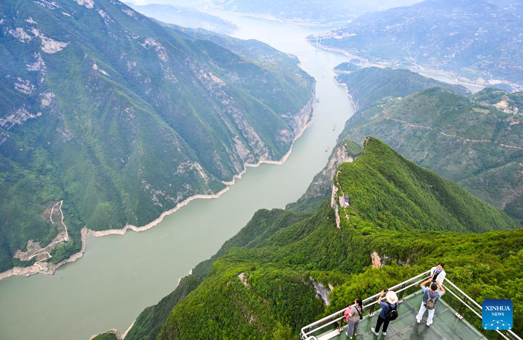 People look at the Qutang Gorge from an observation deck in Chongqing, southwest China, June 9, 2025. Acting as a crucial ecological gateway for the upper reaches of the Yangtze River, Chongqing has intensified its environmental protection efforts in recent years.