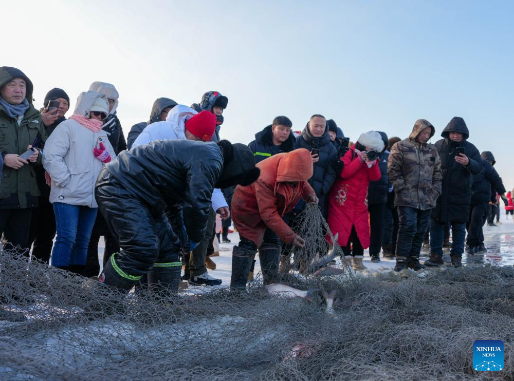 Fishermen haul the net out of the ice-covered Chagan Lake in Songyuan, northeast China's Jilin Province, Jan. 7, 2026. The 24th Chagan Lake Ice and Snow Fishing and Hunting Cultural Tourism Festival opened here on Thursday.