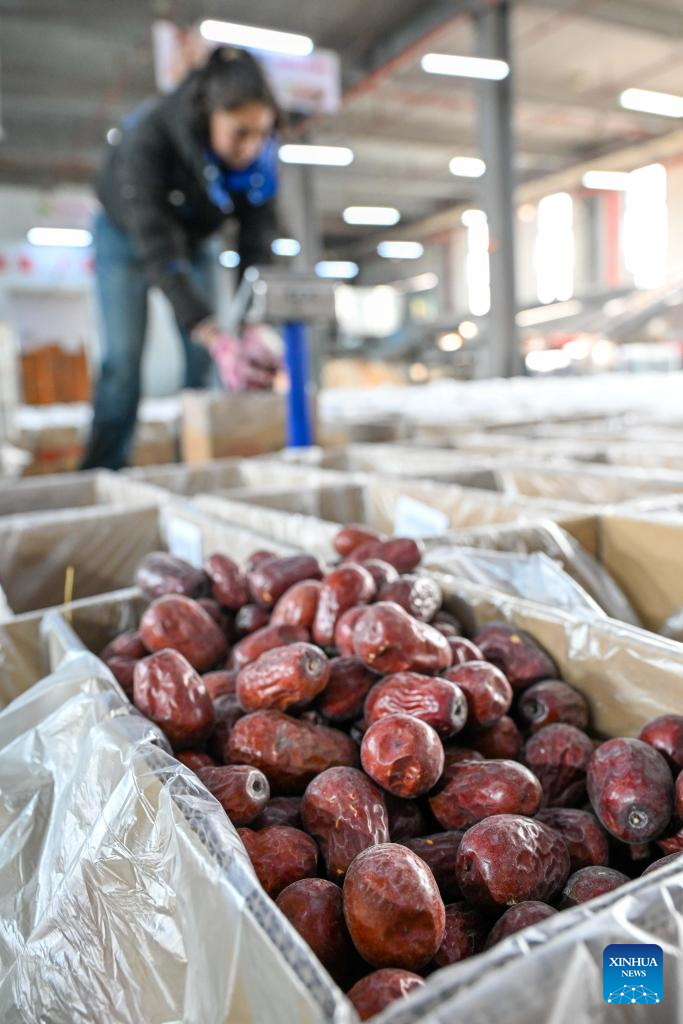 A staff member selects red jujubes at a food company in Moyu County, Hotan Prefecture, northwest China's Xinjiang Uygur Autonomous Region, Jan. 9, 2026. Premium Xinjiang goods like walnuts and red jujubes, which are popular choices for customers nationwide for the Chinese New Year, have entered their peak sales season as the Spring Festival approaches. E-commerce companies in Hotan are leveraging live-streaming sales and online shopping festivals to promote high-quality agricultural products of Xinjiang, boosting farmers' incomes and rural revitalization. (Xinhua/Ding Lei)