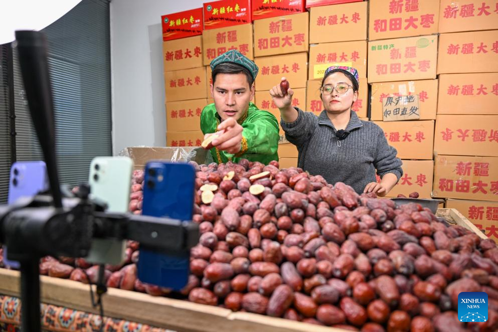 Staff members promote products via live-streaming at a network technology company in Moyu County, Hotan Prefecture, northwest China's Xinjiang Uygur Autonomous Region, Jan. 9, 2026. Premium Xinjiang goods like walnuts and red jujubes, which are popular choices for customers nationwide for the Chinese New Year, have entered their peak sales season as the Spring Festival approaches. E-commerce companies in Hotan are leveraging live-streaming sales and online shopping festivals to promote high-quality agricultural products of Xinjiang, boosting farmers' incomes and rural revitalization. (Xinhua/Ding Lei)