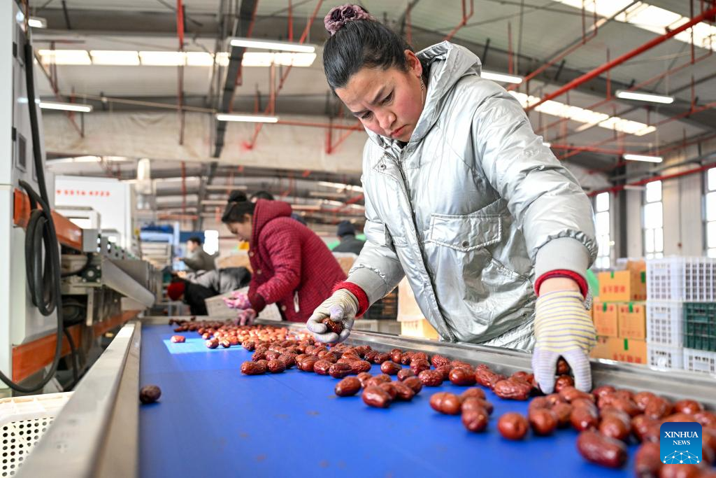 Employees sort red jujubes at a food company in Moyu County, Hotan Prefecture, northwest China's Xinjiang Uygur Autonomous Region, Jan. 9, 2026. Premium Xinjiang goods like walnuts and red jujubes, which are popular choices for customers nationwide for the Chinese New Year, have entered their peak sales season as the Spring Festival approaches. E-commerce companies in Hotan are leveraging live-streaming sales and online shopping festivals to promote high-quality agricultural products of Xinjiang, boosting farmers' incomes and rural revitalization. (Xinhua/Ding Lei)
