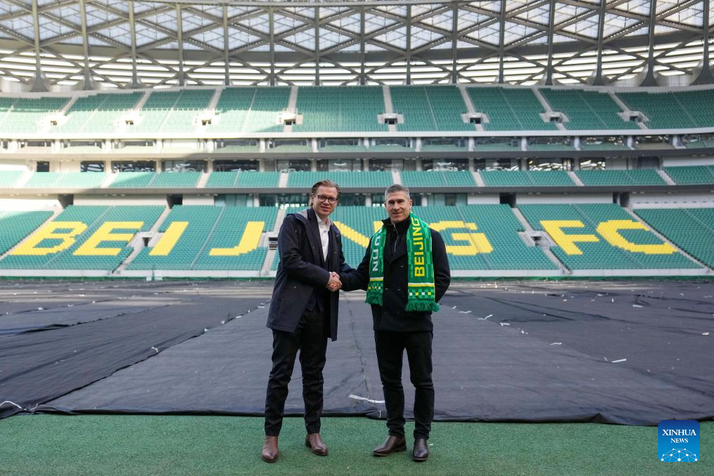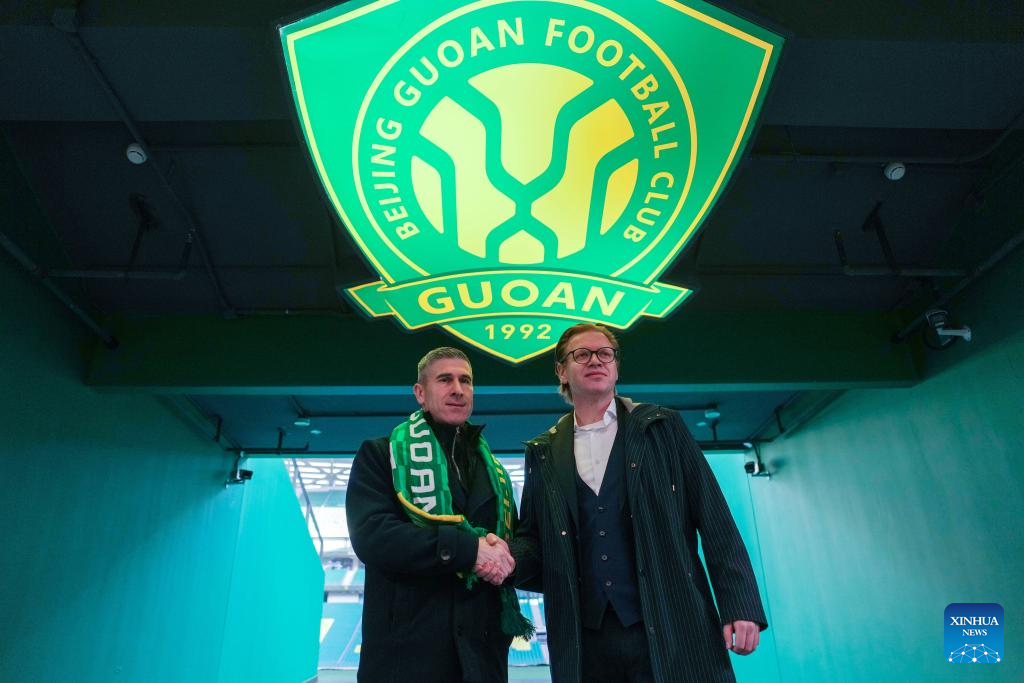 Matthias Brosamer (R), new sports general manager of Beijing Guoan Football Club, and Nick Montgomery, new head coach of Beijing Guoan, the Chinese Super League (CSL) club, shake hands at the Worker's Stadium in Beijing, capital of China, Jan. 12, 2026. (Xinhua/Ju Huanzong)