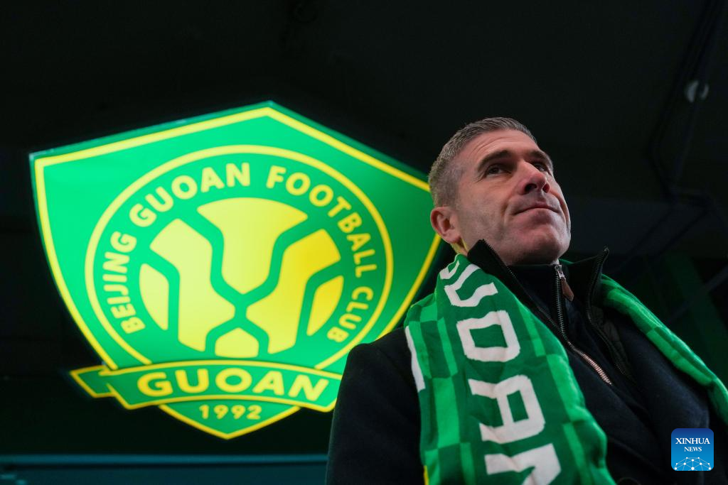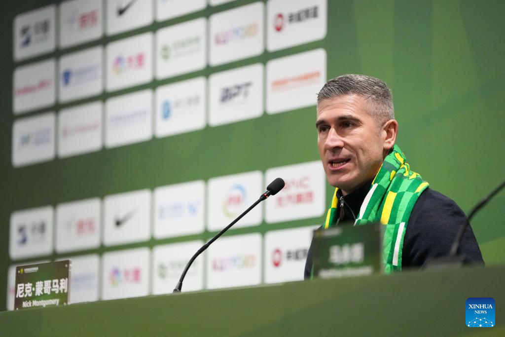 Nick Montgomery, new head coach of Beijing Guoan, the Chinese Super League (CSL) club, speaks during a press conference at the Worker's Stadium in Beijing, capital of China, Jan. 12, 2026. (Xinhua/Ju Huanzong)