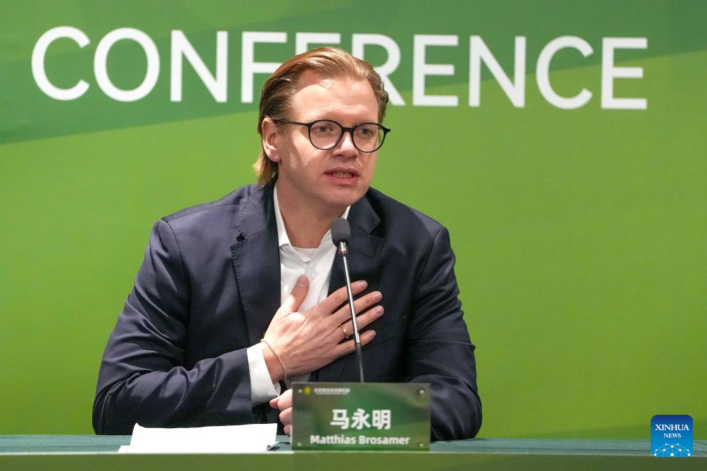 Matthias Brosamer, new sports general manager of Beijing Guoan Football Club, speaks during a press conference at the Worker's Stadium in Beijing, capital of China, Jan. 12, 2026. (Xinhua/Ju Huanzong)