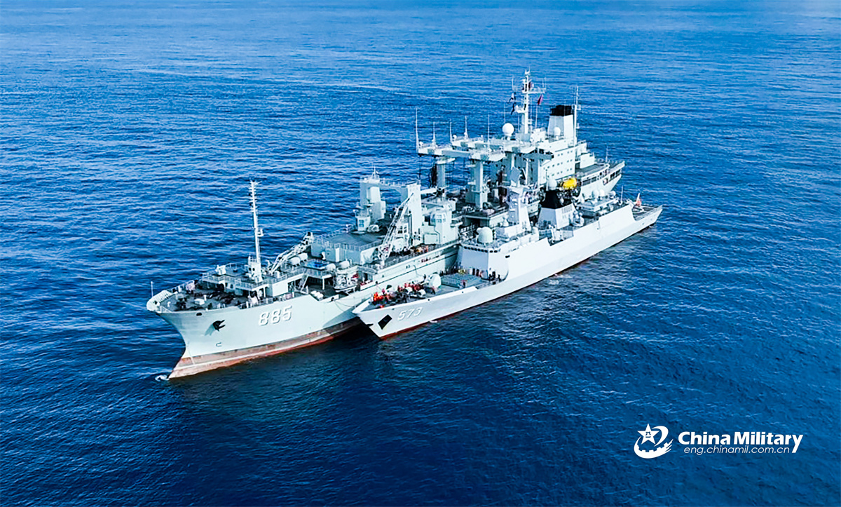 Frigate Liuzhou (Hull 573) and comprehensive supply ship Qinghaihu (Hull 885) attached to a flotilla with the navy under the Chinese PLA Southern Theater Command moor at sea and conduct alongside replenishment during a replenishment-at-sea training exercise in early January, 2026. (eng.chinamil.com.cn/Photo by Li Junlin)