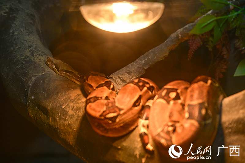 A snake stays warm with the help of a heating device at the Nanning Zoo in Nanning, south China's Guangxi Zhuang Autonomous Region. (People's Daily Online/Lei Qijun)