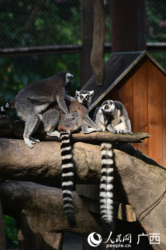 Ring-tailed lemurs snuggle together basking in the sun at the Nanning Zoo in Nanning, south China's Guangxi Zhuang Autonomous Region. (People's Daily Online/Lei Qijun)