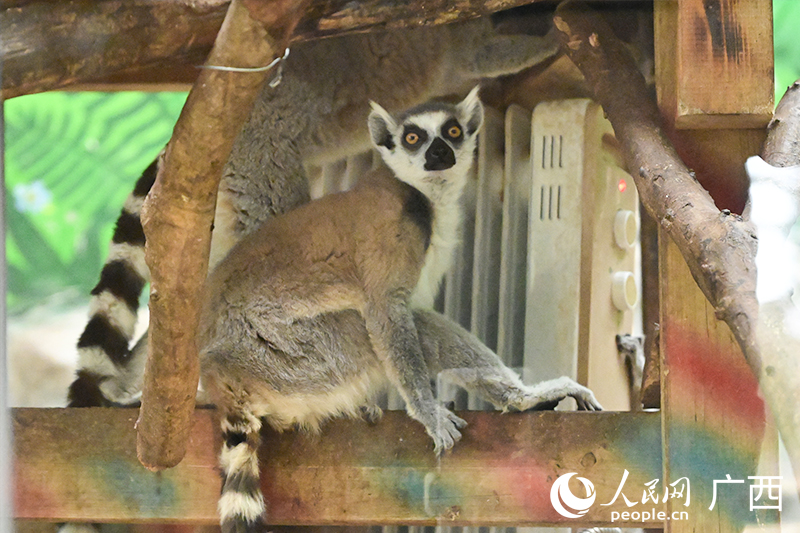 Ring-tailed lemurs stay warm with the help of a heating device at the Nanning Zoo in Nanning, south China's Guangxi Zhuang Autonomous Region. (People's Daily Online/Lei Qijun)