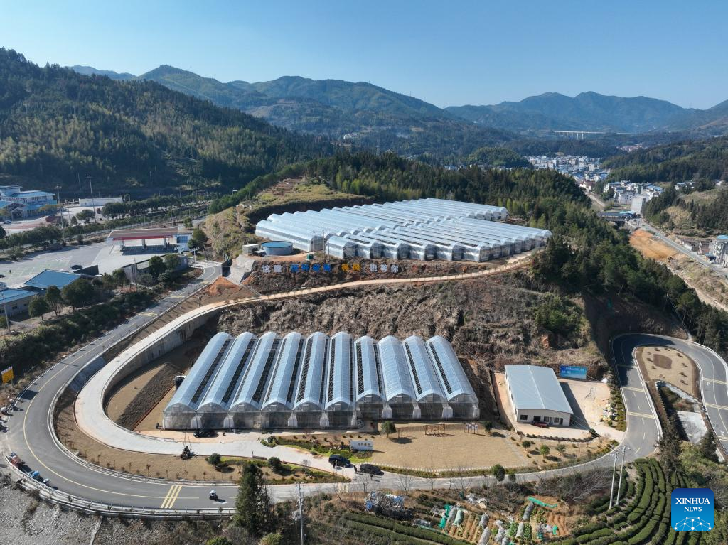 This aerial drone photo taken on Jan. 15, 2026 shows flower greenhouses in Qibu Township of Zhouning County, southeast China's Fujian Province. With the approach of the Spring Festival, the market for high-altitude, cold-tolerant flowers has been steadily heating up. Inside the greenhouses of various flower enterprises, flowers in Zhouning County are blooming in full swing. Workers are busy with picking, pruning, shaping, and packaging to ensure sufficient market supply during the holiday season.