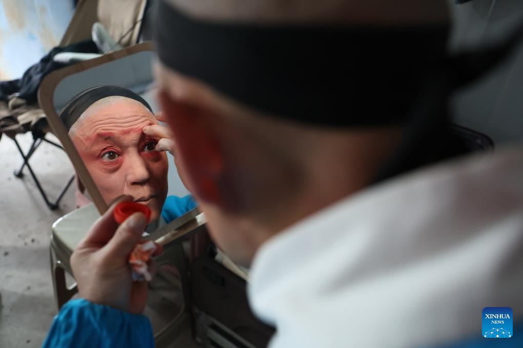 A Qinqiang opera artist prepares for a performance at a Spring Festival shopping market in Anding District of Dingxi City, northwest China's Gansu Province, Jan. 19, 2026. The Spring Festival shopping market opened its doors at the potato trading center in Anding District of Dingxi City on Monday and will run until Chinese Lunar New Year's Eve.