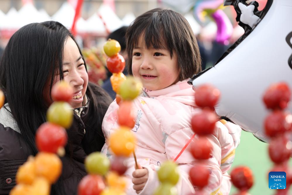 A child chooses a Tanghulu, a traditional Chinese snack consisting of sugar-coated haws or fruits, at a Spring Festival shopping market in Anding District of Dingxi City, northwest China's Gansu Province, Jan. 19, 2026. The Spring Festival shopping market opened its doors at the potato trading center in Anding District of Dingxi City on Monday and will run until Chinese Lunar New Year's Eve.